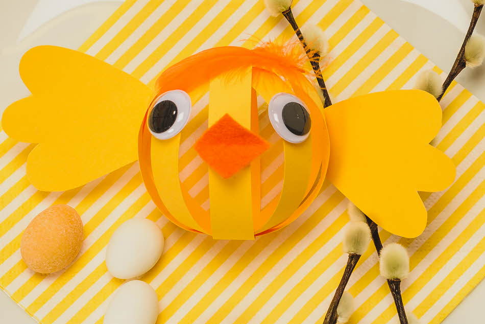 Papir-påskekylling laget av gult papir med oransje nebb og fjær til hår på en tallerken