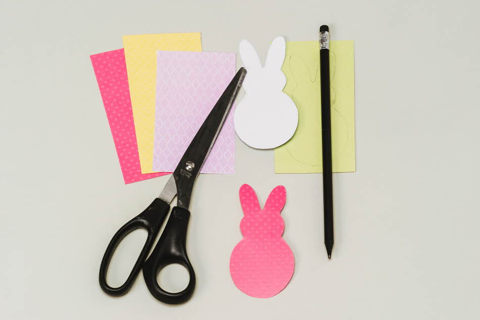 1. Tegn opp en kanin på et hvitt ark og klipp den ut. Denne bruker du som riss og legger den på dekorpapiret og tegner med en blyant rundt. Klipp ut så mange du ønsker. Bruk gjerne ulikt papir.