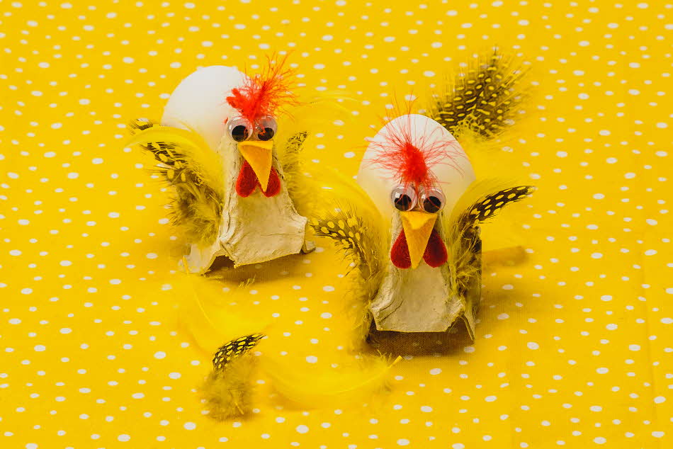 To høner, fylt med hvert sitt egg, laget av eggekartong, filtbiter og fjær på en gulprikkede bakgrunn