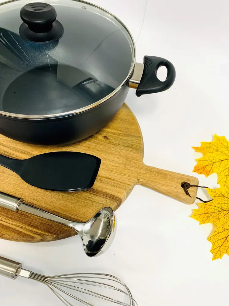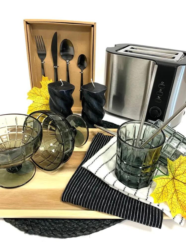Nille har masse lekkert i en litt røff stil, med sorte drikkeglass og serveringsbrett i tre. Mix og match med ulike materialer. En brødrister fra Jernia til 299,- er også kjekt å ha.